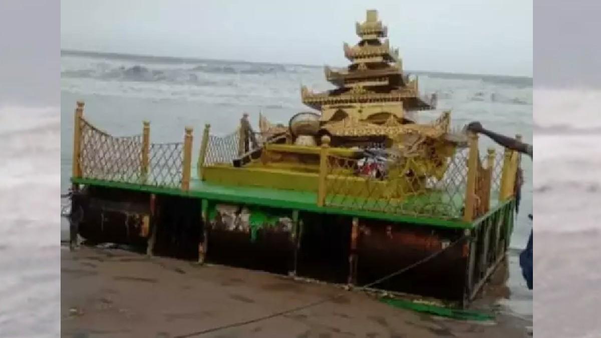 चक्रवाती तूफान असानी (Twister Asani) की वजह से पश्चिम बंगाल, ओडिशा और आंध्र प्रदेश में तूफान उठ रहा है. इसी तूफान की वजह से समुद्र में लहरों के बीच बुधवार को एक सुनहरे रंग का रथ बहकर आ गया.